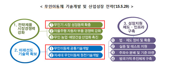 이를 위해 안전성 향상, 난조건 운용 등 필수 기반기술 및 타분야의 뛰어난 ICT 기업들이 드론 분야에 쉽게 진입할 수 있도록 오픈 플랫폼 등을 출연(연)과 대학 등이 개발하여 중소기업에 기술이전하고, 정부나 공공기관의 드론 수요를 기반으로 초기 시장과 맞춤형 기술개발 지원을 동시에 제공함으로써 혁신적 기술력을 갖춘 드론 중소·벤처기업의 출현과 성장을 지원해 나갈 것이라고 밝혔다.