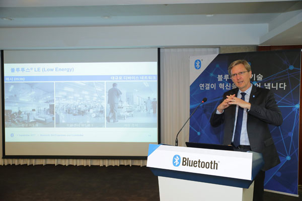 근거리 무선 통신의 국제 표준인 블루투스® 기술 개발을 주관하는 블루투스 SIG(Special Interest Group)가 7일 서울 중구 코리아나 호텔에서 ‘블루투스 연결이 이끄는 혁신’을 주제로 기자간담회를 개최했다. 이날 행사에서는 켄 콜데럽 (Ken Kolderup) 블루투스 SIG 마케팅 부사장이 참석해 블루투스® 메시 발표와 함께 블루투스® 기술 동향 및 향후 로드맵에 대해 소개했다.