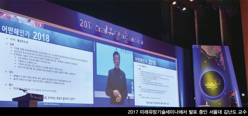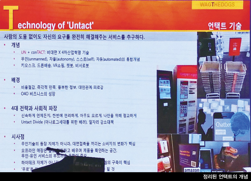 11월 23일 한국과학기술정보연구원 주최로 열린 2017 미래유망기술세미나에 참석한 김 교수는 발표를 통해 2018 트렌드 웩더독을 발표하고, 이와 관련된 주요 키워드로 ▲워라밸 ▲작지만 확실한 행복, 소확행 ▲나만의 케렌시아 ▲대안관계 ▲매력자본 ▲플라시보 ▲언택트 ▲만물의 서비스화 ▲미닝아웃 ▲소비를 통한 자존감 회복 등을 소개했다. 김 교수는 여러 키워드 중 4차 산업혁명, IT 산업과 밀접한 관련 있는 주제인 ‘언택트’를 자세히 소개했다.