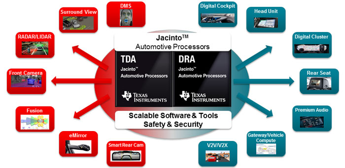- DRA76: 최대 2880x1080 픽셀의 고해상도 디스플레이, 다중의 1080p 디스플레이, 다중 운영체제/다중 도메인 시스템, 통합 서라운드 뷰(GPU, MPU, 메모리 대역폭, ISP가 제공하는 여유 성능 활용)