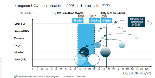자동차 회사들은 2020년까지 CO2 배출을 대략 95 g/km 수준에 맞춰야만 한다. 그러나 바이오 디젤 등 대체연료차를 포함한다고 해도 달성이 불가능한 상황이다. 유럽연합은 하이브리드 기술, 클린디젤과 가솔린 엔진의 개선, 기타 연비절감 대책을 총동원할 경우 110 g/km은 달성할 것으로 보고 있다. 결과적으로는 10 g/km를 더 낮춰야만 한다.