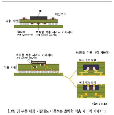 이러한 소형화와 대용량화가 진행되는 한편, 최근 적층 세라믹 커패시터는 1 mm 미만의 박형화가 요구되고 있다. PCB에 전자부품을 수평 배치하는 기존 방식에 의한 고밀도 실장이 한계에 다다르고 있기 때문이다. 이 한계를 극복하기 위해 등장한 기술이 바로 부품 내장 기판이다. 이것은 다층화된 PCB 내부에 집적회로(IC)와 커패시터와 같은 수동부품을 박형화해 내장하는 기술이다.