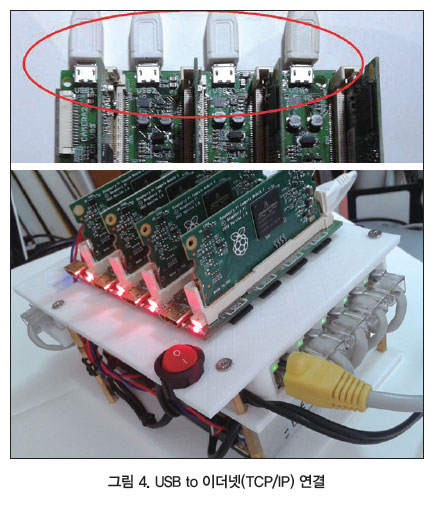 그림 2는 SmartPrince 병렬처리 보드의 외형이다. 라즈베리파이3 컴퓨팅 모듈을 세로방향으로 장착할 수 있는 슬롯을 4개 배치하여 공간을 절약했다. 단일 5V 전원공급으로 모듈 4개가 한꺼번에 동작한다. 모듈끼리 데이터 교환할 수 있도록 I2C와 SPI 인터페이스를 연결했고, 모듈마다 USB 포트를 통하여 외부로 데이터 통신할 수 있도록 했다. USB에는 각종 장치들을 연결할 수 있다. 특히 WiFi 무선통신 및 TCP/IP 유선 이더넷 통신선을 연결할 수 있도록 구성하여 네트워크 병렬처리 클러스터로 확장해 나갈 수 있다.
