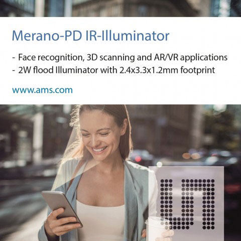 ams는 사용자 얼굴인식 같은 모바일 3D 센싱 애플리케이션에 균일한 조명 출력을 제공하는 적외선(IR) 레이저 투광조명(flood illuminator) 모듈 ‘MERANO-PD’를 출시한다고 밝혔다.