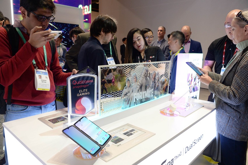 G8X: LG전자가 CES 2020 전시회에서 시장을 선도하는 혁신 제품과 서비스를 대거 선보였다. LG전자 부스를 찾은 관람객들이 LG 듀얼 스크린을 적용한 전략 스마트폰 LG G8X ThinQ(국내명 LG V50S ThinQ)를 살펴보고 있다.