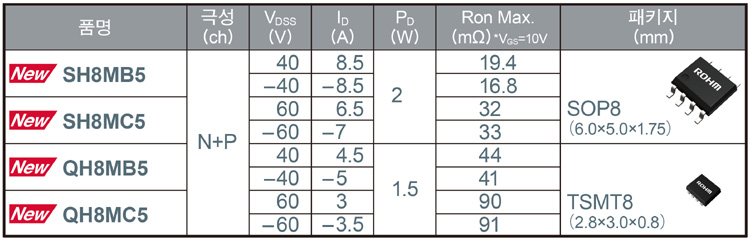 로옴(ROHM) 주식회사는 FA 기기 등의 산업기기 및 기지국 (냉각용 팬)에 탑재되는 모터의 구동에 최적이며, 24V 입력에 대응하는 ±40V / ±60V 내압의 MOSFET를 2개 탑재한 듀얼 제품 「QH8Mx5 / SH8Mx5 시리즈 (Nch+Pch)」를 개발했다.