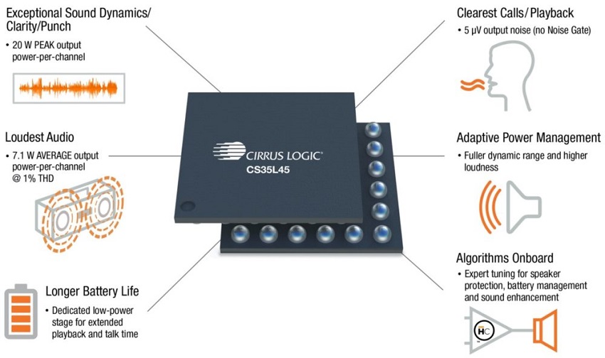 씨러스 로직의 최신 앰프 솔루션인 CS35L45는 업계 최고 성능의 부스트 앰프 IC로 플래그십 스마트폰 오디오 성능의 벤치마크가 되어가고 있다. 또한, CS35L45는 스마트폰 제작 업체가 스피커를 보호하고 배터리 수명을 유지하는 동시에 베이스나 품질을 저하하지 않고 더 큰 음량과 다이나믹 레인지를 제공할 수 있도록 지원한다.