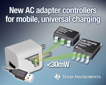 TI는 대기 전력 소모를 절감하는 혁신적인 고효율 전원관리 컨트롤러인 UCC28700을 출시했다. 이 제품을 통해 5W 큐브 어댑터를 사용하는 스마트폰 사용자들은 어댑터를 플러그인한 채 두어도 전력소비에 대한 부담을 한 층 덜 수 있게 됐다. 신제품 UCC28700은 1차 측 컨트롤러 제품으로써 큐브 어댑터, 무선 충전 장치, 기타 AC 전원 장비 크기를 소형화하여 공간을 절약할 수 있다. 이와 함께 TI는 지능형 USB 충전 컨트롤러 제품인 TPS2511를 출시했다. 이 컨트롤러 칩은 USB 배터리 충전 표준 1.2 사양을 충족시키며, 주요 스마트폰 및 5V 태블릿 PC 충전 어댑터에 폭넓게 사용할 수 있다.