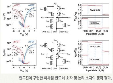 연구팀은 이러한 페르미준위 고정현상이 2차원 전극 신소재 이용할 때 완화된다는 데 착안, 반도체 소자의 N형 또는 P형 특성을 자유자재로 제어하여, 궁극적으로 인버터(Inverter), 노어(NOR), 낸드(NAND) 등 고성능 논리소자를 개발하는 데 성공하였다.