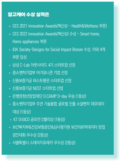 특히 영양제 관련 서비스로서는, CES가 최초로 인정한 혁신성이다. 알고케어는 50년 전이나 지금이나 비슷한 건강기능식품 시장의 구조와 사용자 경험을 혁신하는 모델로서 세계 최대 테크 전시인 CES에서 2021년 Healthcare & wellness 분야에서, 2022년에는 Smart home, Home appliances 분야에서 2년 연속 총 3개 부문 혁신상(Innovation Awards)을 수상하여 글로벌 시장에서의 혁신성을 인정받았다.
