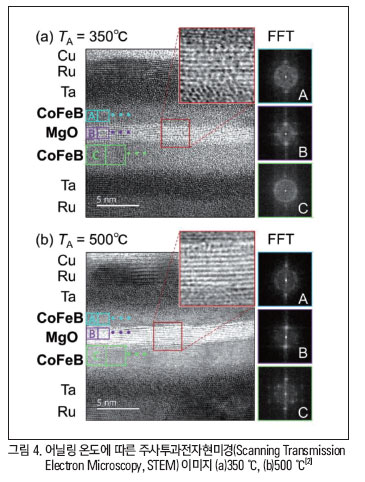 스핀 의존 터널링의 결과인 TMR은 기판에 따른 차이가 존재하나 그림 3에서 보듯이 일반적으로 특정 어닐링 온도까지 증가하는 경향이 존재한다. 이는 MgO 층의 결정성 증가로 인한 결과이다. 그림 4는 어닐링 온도에 따른 결정성 변화를 보여주고 있는데, 해당 시료의 경우 어닐링 온도가 350 ℃일 경우에 비해 500 ℃에서 어닐링을 진행한 경우 결정성이 향상된 모습을 보여준다.