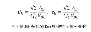 식 2는 증폭기로부터 얻은 값들을 바탕으로 MOKE의 매개변수인 θk와 εk를 도출하는 계산식이다. 이때, 3가지 전압 값이 필요로 한다. V1f, V2f는 lock-in 증폭기로부터 얻은 조화 신호의 전압, VDC는 DC 전압이다. J1, J2는 베셀 함수 계수로 베셀 함수를 계산하여 얻는 값으로 φ0 = 2.4048 rad 에서 J1 = 0.51915, J2 = 0.43175의 값을 나타낸다. √2는 lock-in 증폭기가 rms 전압을 나타내기 때문에 사용되었다.