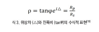 이때, 반사되는 S-편광과 P-편광의 비율을 프레넬 방정식(Fresnel equation)에 적용하면, s-편광과 p-편광 간의 위상차와 진폭비의 개념이 정의되면 식 3과 같이 표현된다. 이때, RP는 p-편광의 반사율, RS는 s-편광의 반사율, 그리고 ρ는 복소 반사율(complex reflectance ratio)를 의미한다.