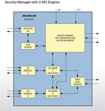 맥심은 2개의 하드웨어 AES(Advanced Encryption Standard) 엔진이 내장된 탬퍼 리액티브 암호 노드 컨트롤러 MAX36025를 출시했다. MAX36025는 스마트 그리드 네트워크의 액세스 포인트/데이터 집중기에 설치해 데이터 집계 시 핵심 포인트에 보안을 추가할 수 있는 보안 매니저이다. MAX36025에 내장된 2개의 하드웨어 AES 엔진은 암호화를 하드웨어 내부에 구현해 설계 시간을 단축시키고 보안 레벨을 높인다. 최종적으로 시스템 설계자는 작성, 디버깅 및 구현에 오랜 시간이 걸리는 암호화 코드를 쓰는 작업에서 벗어날 수 있다. 또한 AES 엔진은 독립적인 채널에 사용해 서로 다른 네트워크를 보호하거나 동일한 채널에서 이중 암호화를 제공할 수 있다. 한편 MAX36025는 -55 °C ~ +95 °C 온도 범위에서 동작하며, 보안 특성 상 데이터 시트나 기타 제품 정보의 공개 전에 NDA(nondisclosure agreement)를 요구한다.
