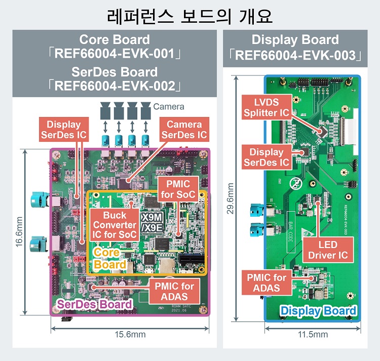 이번에 로옴은 「X9H」의 레퍼런스 보드에 탑재한 SerDes IC와 더불어 SoC에 전원을 공급하는 SoC용 PMIC (BD96801Q12-C) 및 벅 컨버터 IC (BD9SA01F80-C), SerDes IC에 전원을 공급하는 ADAS용 범용 PMIC(BD39031MUF-C)를 새롭게 제공한다. 이에 따라 본 솔루션을 통해 최대 3개의 디스플레이 투영과 4개의 ADAS 카메라(서라운드 뷰 카메라) 구동을 실현할 수 있다.