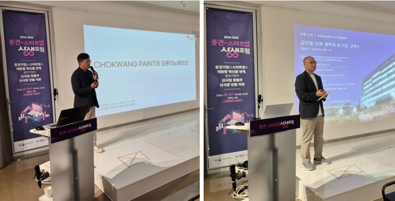 중견-스타트업 상생포럼 조광페인트 서순석 신사업실 실장(좌측) 발표와 ㈜코맥스 김시현 부문장 발표 모습