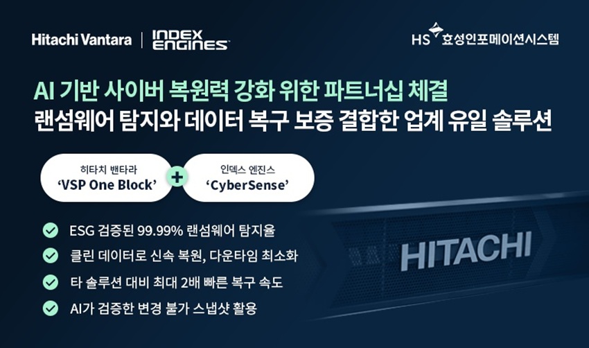 HS효성인포메이션시스템(대표 양정규)은 히타치 밴타라(Hitachi Vantara)가 인덱스 엔진스(Index Engines)와 전략적 파트너십을 체결하고 기업의 사이버 복원력 강화를 위한 통합 솔루션을 선보였다고 밝혔다.