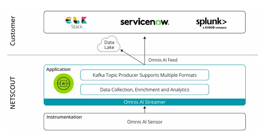 옴니스 AI 센서(Omnis AI Sensor)에서 생성된 고신뢰 메타데이터는 옴니스 AI 스트리머(Omnis AI Streamer)를 통해 다양한 용도별 데이터 피드로 구성되며, 이를 기반으로 조직은 운영 효율성 강화, 보안 고도화, 장애 원인 분석 및 신속한 복구 등 비즈니스 연속성 확보에 필요한 인텔리전스를 확보할 수 있다. 이 메타데이터는 네트워크 전역에 배치된 센서 및 InfiniStreamNG®, vSTREAM®, CyberStream® 기반 센서를 지원하는 어댑터를 통해 수집되며, NETSCOUT의 분석 기술로 문맥 기반 텔레메트리로 정제되어 데이터 레이크 또는 Splunk·ELK Stack·ServiceNow 등 외부 플랫폼으로 스트리밍된다.