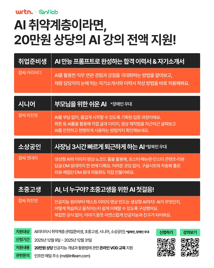 국내 최대 온라인 교육 플랫폼 인프런(운영사 인프랩)과 생성형 AI 기업 뤼튼테크놀로지스가 디지털 취약계층을 위한 ‘AI 리터러시 바우처 기반 교육 프로그램’을 정식 오픈하고, 총 20만 원 상당의 AI 입문 강의를 전액 무료로 지원한다고 12월 12일 밝혔다.
