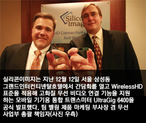 실리콘 이미지(Silicon Image)는 스마트폰과 태블릿 등 모바일 기기용 단일 칩 60 GHz Wireless HD 모바일 트랜스미터 “UltraGig 6400”을 올 여름부터 양산·공급한다고 밝혔다.