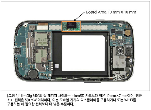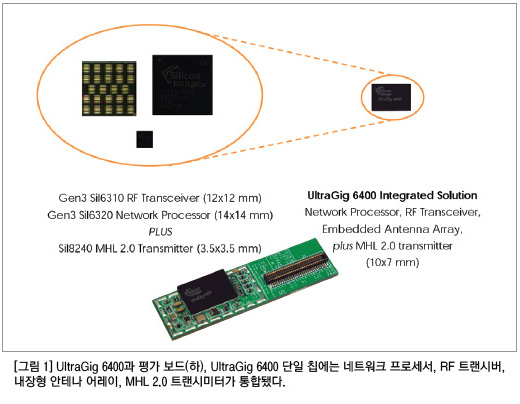 UltraGig 6400에 적용된 WirelessHD 표준은 60 GHz 대역의 무선 신호를 이용해 1080/60 p의 HD 신호를 압축하지 않고 무선으로 전송하는 기술이다. UltraGig 6400은 실리콘 이미지의 제4세대 Wireless HD 칩으로, 60 GHz의 RF 트랜시버, 베이스밴드 네트워크 프로세서, 내장형 안테나 어레이를 단일 IC 패키지에 통합했다. 패키지 사이즈는 microSD 카드보다 작은 10 mm×7 mm이며, 평균 소비 전력은 500 mW 이하이다. 이는 모바일 기기의 디스플레이를 구동하거나 Wi-Fi를 구동하는 데 필요한 전력보다 더 낮은 수준이다.