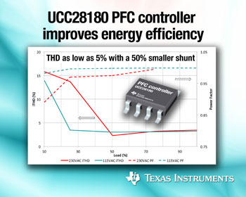 TI 코리아(대표이사 켄트 전)는 연속 전도 모드에서 동작하며, 업계에서 가장 넓은 범위의 프로그래머블 주파수를 제공하는 역률 보정(PFC, power factor correction) 컨트롤러를 출시했다. 8 핀 PFC controller UCC28180은 기존 솔루션에 비해 전력 소비는 절반으로 줄이고, 0.95 이상의 역률 을 달성함으로써 산업용, 서버 전원, 에어컨, 조명, 소비 가전, 가정 및 사무실 전자 기기와 같은 범용 입력 AC/DC 애플리케이션에 적합하다. (샘플 주문에 관한 내용은 http://www.ti.com/ucc28180-pr-kr 참조)