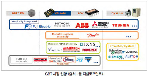 전력모듈, 더 정확히 IGBT(절연 게이트 양극성 트랜지스터)는 이러한 성장을 주도할 것으로 예측된다. 이 모듈은 2014년부터 2020년까지 연평균 성장률 10.3%를 기록할 전망이다. IGBT 모듈의 이러한 성장은 효율성과 열전도율(thermal conductivity) 측면에서의 전반적인 기능 향상에 따른 것이다. 개별소자(discrete components)는 약 5.1%의 성장을 보일 것으로 예측된다. 와이드 밴드 갭 소자 시장 역시 2020년까지 5%의 성장률을 나타낼 전망이다.