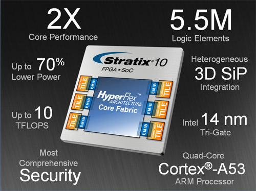 Stratix 10 FPGA 및 SoC은 Intel®의 14nm Tri-Gate 프로세스를 기반으로 하고 Altera의 혁신적인 HyperFlex™ FPGA 패브릭 아키텍처를 적용함으로써 이전 세대 FPGA들에 비해서 2배 더 높은 코어 성능을 제공한다. 업계에서 가장 성능이 높고 밀도가 높은 FPGA인데다 첨단의 임베디드 프로세싱, GPU급 부동소수점 연산 성능, 이종적 3D SiP 집적을 결합함으로써 고객들이 이전에 가능하지 않았던 방식으로 차세대 통신, 데이터센터, IoT 인프라, 방위, 고성능 컴퓨팅 시스템의 까다로운 요구를 충족할 수 있도록 한다.