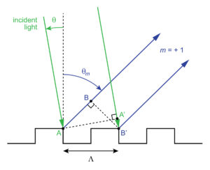 θm은 산란된 빛의 출사 각도, θ는 입사된 빛의 입사 각도, λ는 입사된 빛의 파장, Λ는 grating 주기, m은 산란된 빛의 차수로 정수 값이다. 왼쪽 그림은 grating 구조에서 빛의 입사, 반사를 나타낸 것이고 오른쪽 그림은 산란된 빛의 차수에 따른 산란 양상을 나타낸 것이다. grating 구조를 사용해서 기존보다 더 나은 광 추출 효율을 얻기 위해서는 m 값은 0 또는 1이 되어야 한다. 여기에 grating 주기, Duty Cycle, grating 깊이, grating 각도 등이 격자 구조에서 광 추출 효율에 영향을 준다.