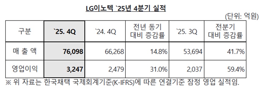 LG이노텍(사장 문혁수)이 한국채택 국제회계기준(K-IFRS)으로 2025년 4분기 영업이익 3,247억원을 기록했다. 이는 전년 동기 대비 31% 증가한 수치다. 매출은 전년 동기 대비 14.8% 증가한 7조6,098억원으로, 분기 매출 기준 역대 최대치를 달성했다.