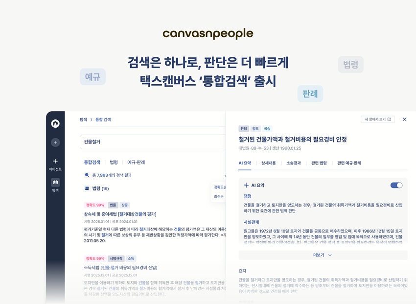 세무 특화 AI 에이전트 ‘택스캔버스(Tax Canvas)’를 운영하는 캔버스앤피플이 세무 전문가의 업무 생산성을 높이기 위한 AI 기반 법령·예규·판례 검색 서비스를 출시한다. 해당 서비스는 1월 30일 공개될 예정이다.