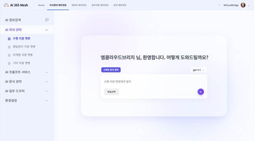엠클라우드브리지(대표 이혁재)가 기업용 AI플랫폼 ‘Ai 365 지식관리 에이전트’가 최근 제조·서비스·전문직군을 중심으로 구축 문의와 실제 도입이 빠르게 늘고 있다고 밝혔다.