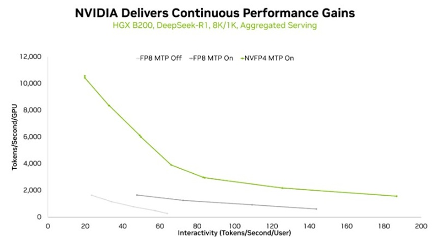 블랙웰 울트라 GPU는 NVFP4 기준 최대 15페타플롭스의 처리량을 제공하며, 동일 GPU에서 FP8 대비 최대 3배 높은 성능을 구현한다. 추론 영역에서는 6,710억 매개변수 규모의 전문가 혼합(MoE) 모델 ‘딥시크-R1(DeepSeek-R1)’에서 FP8 대비 토큰 처리량이 향상된 것으로 나타났다.