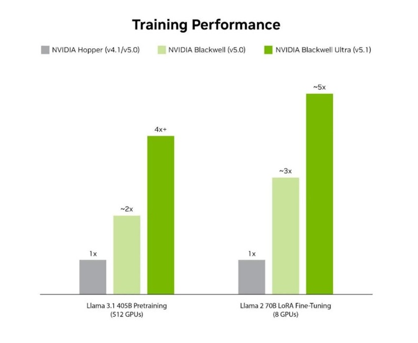 훈련 분야에서도 성과가 확인됐다. 최신 MLPerf Training 벤치마크에서 512개의 블랙웰 울트라 GPU로 구성된 엔비디아 GB300 NVL72 시스템은 NVFP4 정밀도를 활용해 라마 3.1 405B 사전훈련을 64.6분 만에 완료했다. 이는 FP8 기반 블랙웰 GPU 시스템 대비 최대 1.9배 빠른 기록이다고.