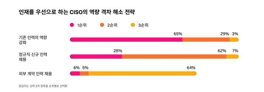 AI의 부상에도 불구하고 CISO들은 역량 격차를 해소하는 주요 수단으로 기술보다 인적 자본을 우선시한다. 주요 전략으로는 기존 인력의 역량 강화(upskilling), 정규직 신규 인력 채용, 외부 계약 인력 채용이 꼽혔다. 이는 위협 헌팅과 같은 고도의 판단력이 필요한 업무에서는 인간의 판단력과 창의성이 여전히 핵심이라는 인식을 반영한다.