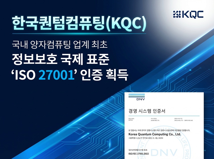 한국퀀텀컴퓨팅(이하 KQC, 대표 김준영)은 3월 12일, 국내 양자컴퓨팅 업계 최초로 국제 표준 정보보호 관리체계인 ‘ISO/IEC 27001’ 인증을 획득했다고 밝혔다.
