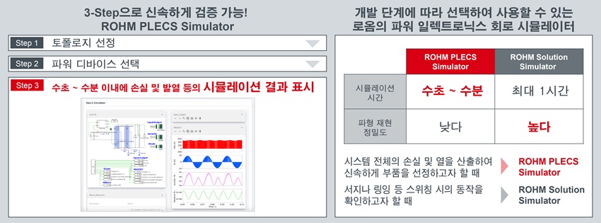 사용자는 웹사이트에 제공된 리스트에서 파워 일렉트로닉스 회로 토폴로지와 로옴의 다양한 파워 디바이스를 선택해 손실 및 온도 상승 등을 수초에서 수분 내에 빠르게 검증할 수 있다. 이를 통해 회로 설계 초기 단계에서 최적의 디바이스를 선정하는 데 소요되는 시간과 공수를 크게 줄일 수 있다는 것이다.