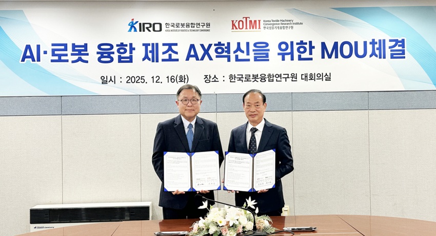 한국로봇융합연구원(원장 강기원)은 12월 16일(화) 본원 대회의실에서 한국섬유기계융합연구원(원장 성하경)과 ‘AI·로봇 융합 기반의 제조 AX(AI Transformation) 혁신을 위한 상호 업무협력 협약(MOU)’을 체결했다고 밝혔다.