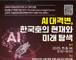 고려대학교 미래성장연구원 AX 전략 포럼과 고려대학교 기술경영전문대학원은 정보통신기획평가원 Tech&Future Insight Forum과 공동으로 11월 6일(목) 르메르디앙 서울 명동 호텔에서 ‘AI 대격변, 한국호의 현재와 미래 탐색’을 주제로 공개 세미나를 개최하여 ‘AX(AI+X) 전략’을 통해 국가 경쟁력을 어떻게 강화할 것인지를 심층적으로 논의할 예정이다.