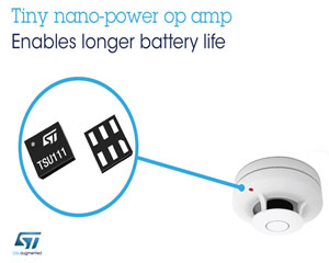 ST마이크로일렉트로닉스가 1.2mm x 1.3mm의 초소형 크기의 평균 전류가 900nA에 불과한 나노-파워 OP 앰프 TSU111을 출시했다.